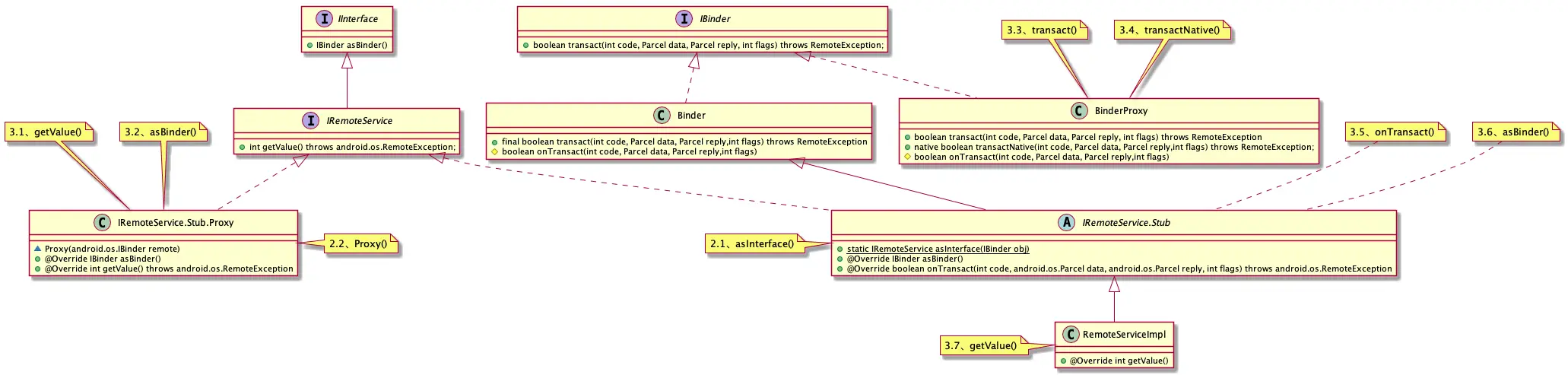 2.3、transactNative()方法最后会调用远程服务IRemoteService.Stub的onTransact()方法,onTransact()方法会通过asBinder()方法获取RemoteServiceImpl,并调用RemoteServiceImpl的实际实现方法。