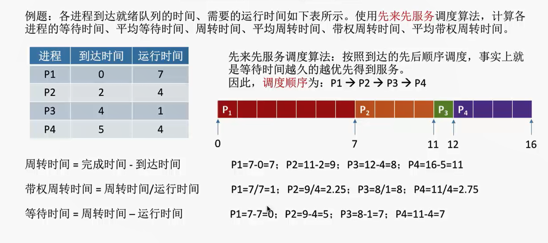 这个就是很自然的谁先到达,谁就先享受服务,所以顺序上就是从 P1 到 P4。注意这里的到达时间,就是前面说过的提交时间。这里不考虑等待 I/O 的情况,否则计算等待时间的时候还需要减去等待 I/O 的时间。