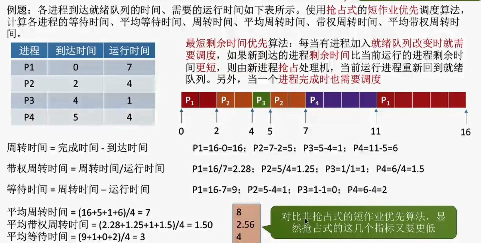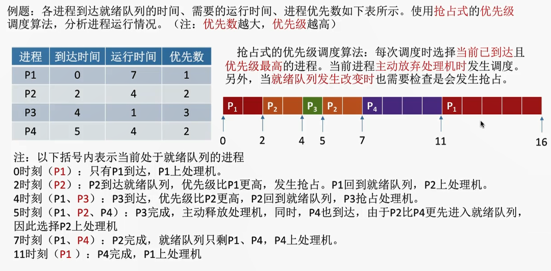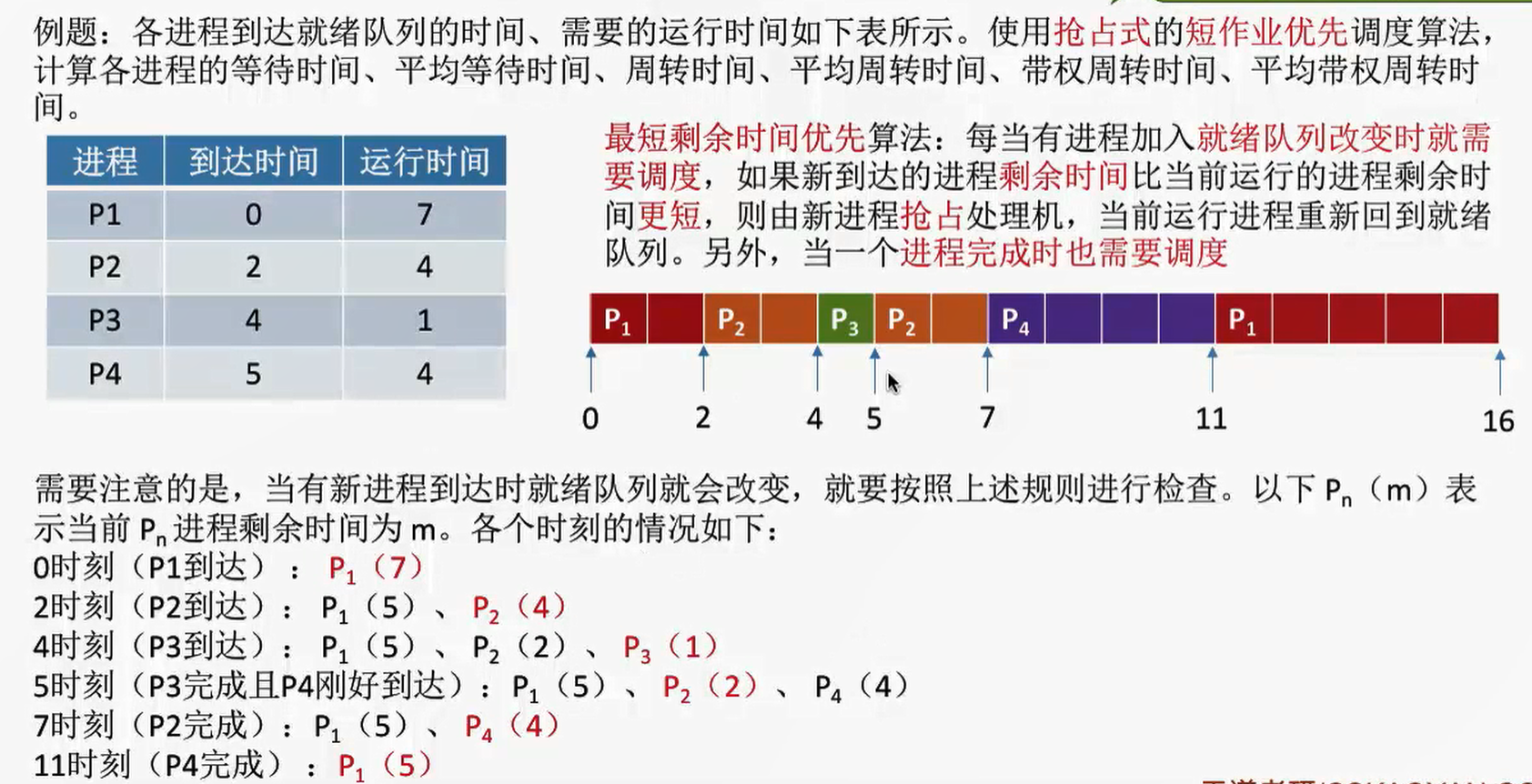 这里同样和 HRRN 算法很像。除了正常运行结束会发生调度之外,每次就绪队列有新的进程到达时还会做一次检查,如果新到达进程优先级高于正在运行进程的优先级,那么新到达进程会抢占处理机。