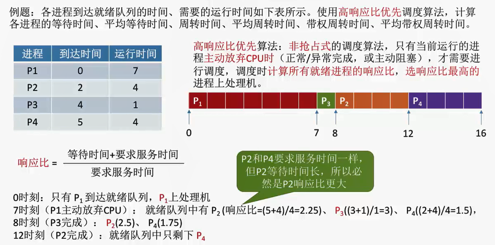 可以说它同时综合了 FCFS 算法和 SJF 算法的优点。为什么优先调度响应比高的进程?因为当两个进程的等待时间一样时,响应比越高的进程,它的实际运行时间越短,这一点类似于 SJF 算法,优先顾及运行时间短的进程;而当两个进程的实际运行时间一样时,响应比越高的进程,它的等待时间越长,等待时间越长说明该进程越先到达,这一点类似于 FCFS 算法,优先顾及先到达的进程。