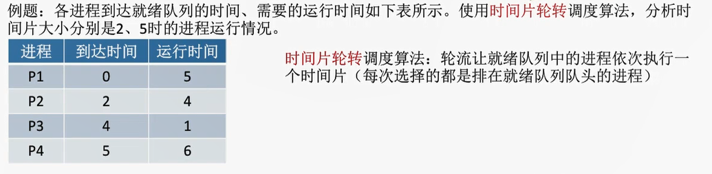 RR 算法即时间片轮转算法。像前面的算法的话,通常都是非抢占式的,也就是说,一个进程正常运行完,另一个进程才有机会被调度,整体呈现出“顺序”的特点;而 RR 算法的特点则在于“公平分配”,按照进程到达就绪队列的顺序,轮流让每个进程执行一个相等长度的时间片,若在自己的时间片内没有执行完,则进程自动进入就绪队列队尾,并调度队头进程运行。整体呈现出“交替”的特点。因为进程即使没运行完也会发生调度,所以这是一个抢占式的算法。