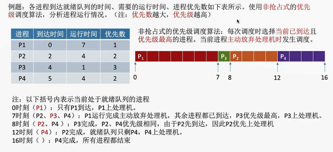 这里和 HRRN 算法是很像的,进程会正常运行,直到结束之后才发生调度,在调度的时候会选择队列中优先级最高的进程。