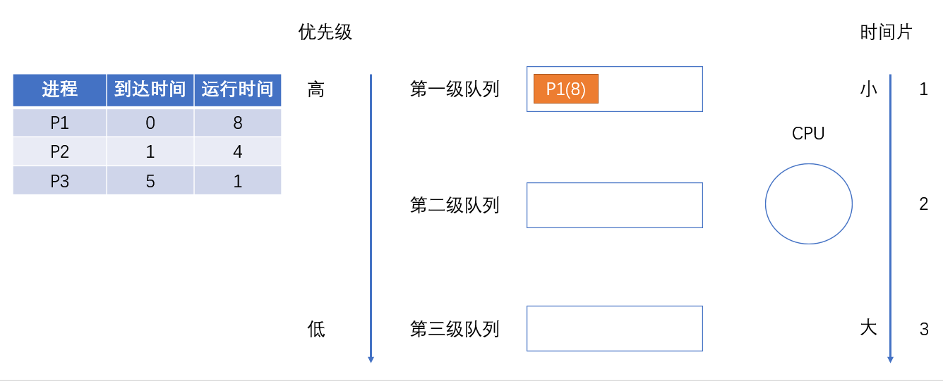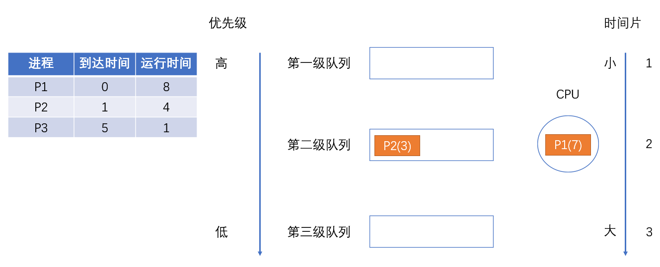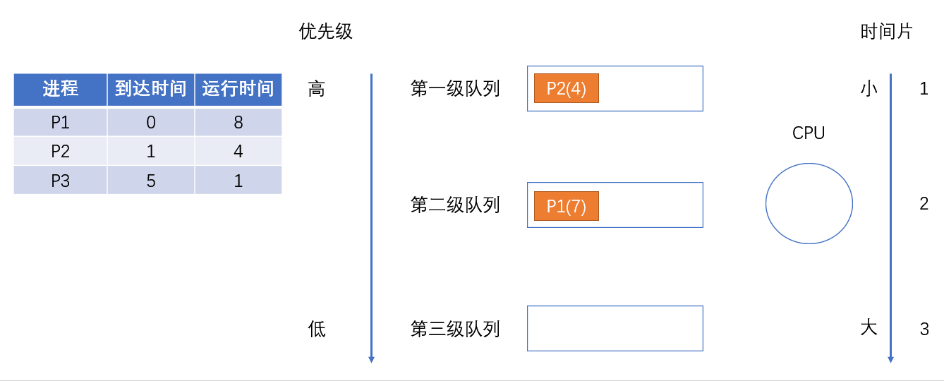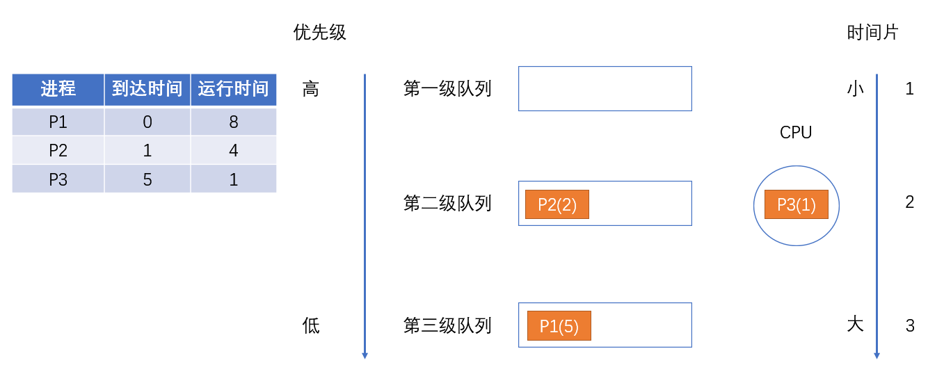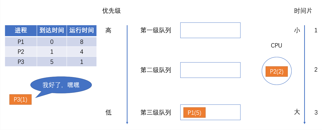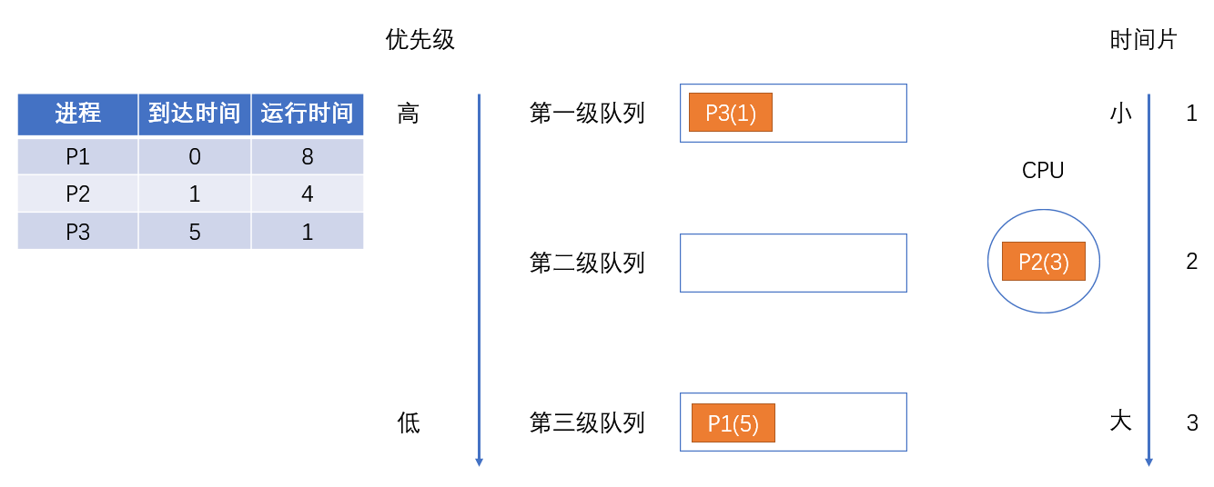 在 5 时刻,P2 时间片还没用完,所以还在正常执行。但是,P3 作为新进程到达了第一级就绪队列