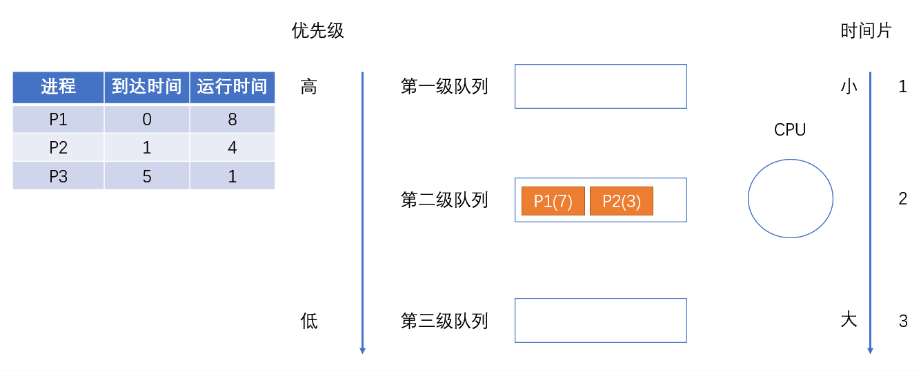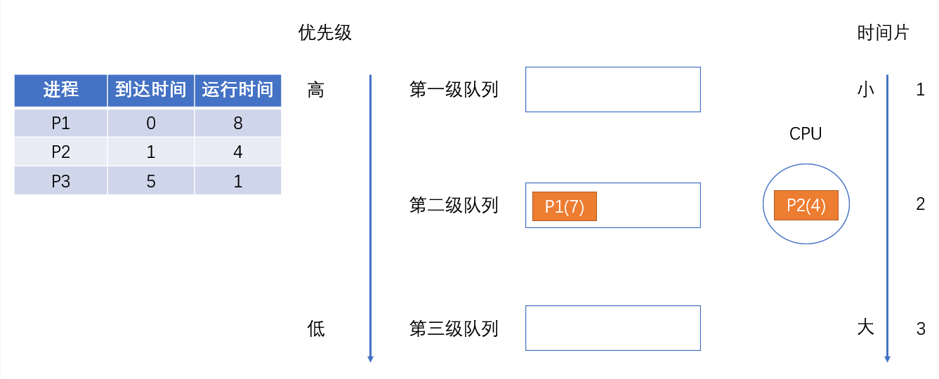 在 2 时刻,P2 时间片已经用完,但是进程还没执行完,所以这时候 P2 也“降级”进入第二级就绪队列