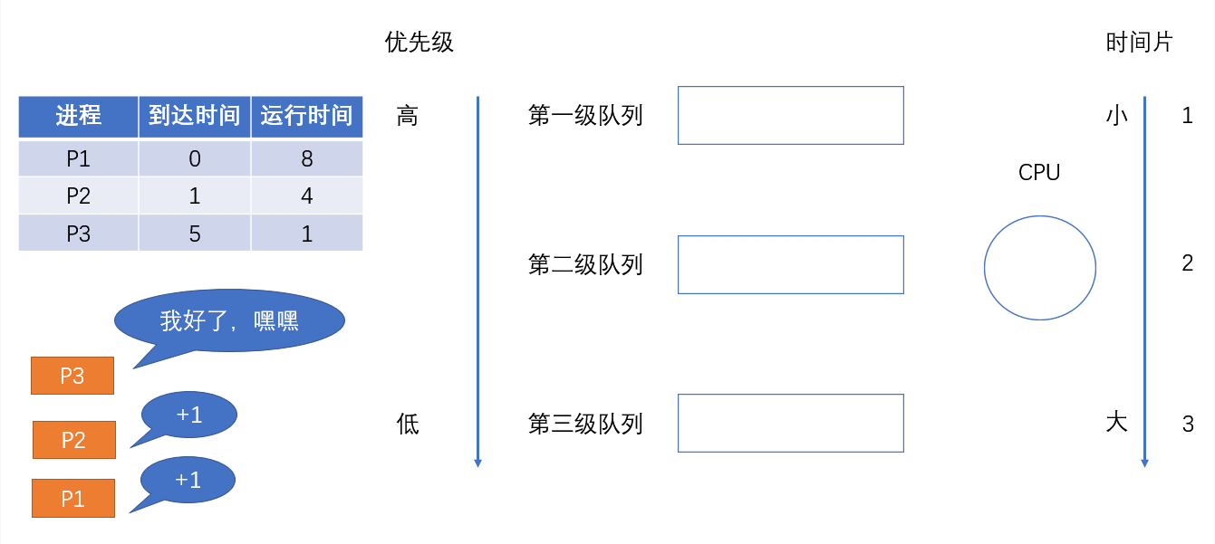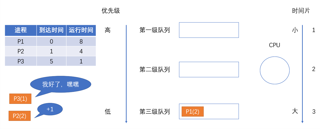 在 3 时刻,P1 时间片没用完,所以继续执行;在 4 时刻,P1 时间片用完,进程却还没执行完,所以再次“降级”来到第三级就绪队列。