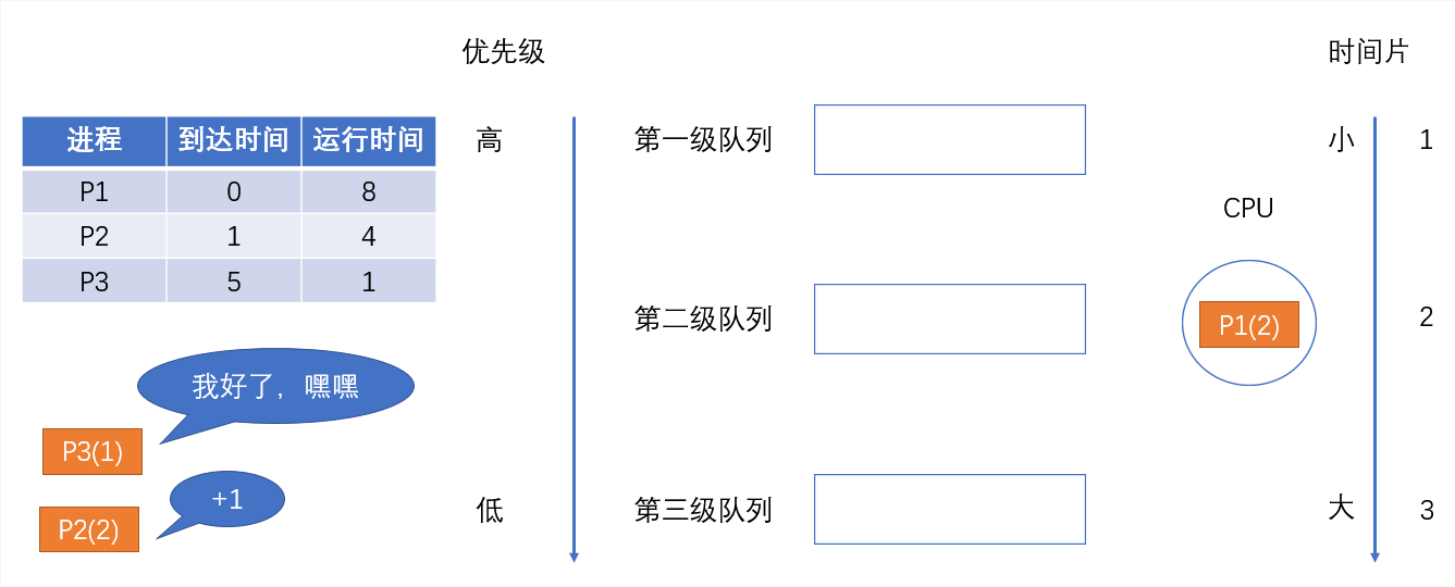 在 1 时刻,P1 时间片已经用完,但是进程还没执行完,所以这时候 P1 “降级”进入第二级就绪队列。同时,P2 作为新进程进入第一级就绪队列
