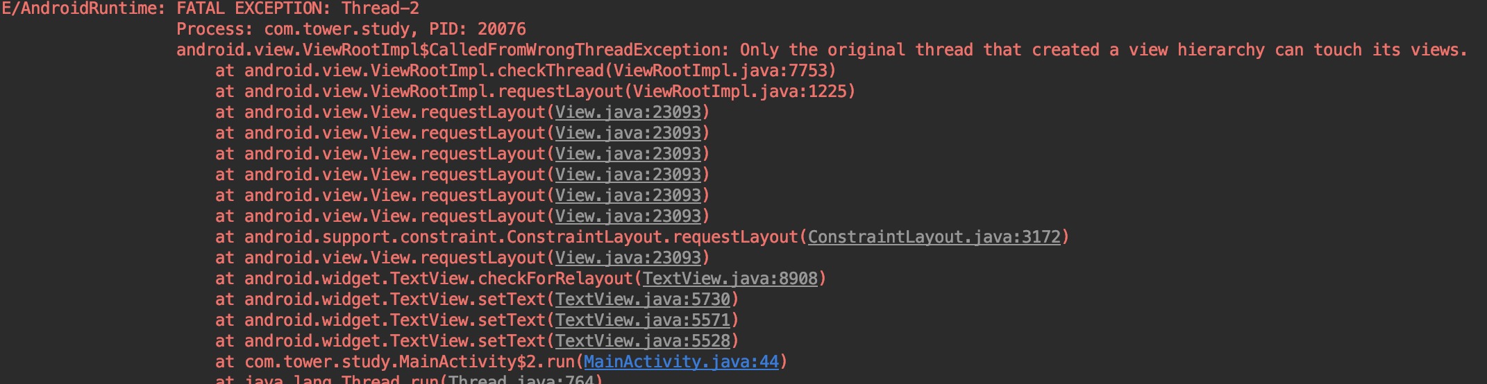 这就是抛出异常的地方(当然直接看异常也可以定位的【手动滑稽】),就是在检查线程,我们当前在子线的调用的setText(),那也就是说mThread肯定是主线程,因为mThread是在ViewRootImpl实例化时创建,而ViewRootImpl是在ActivityThread经过一系列的操作实例化的,所以必然是主线程;