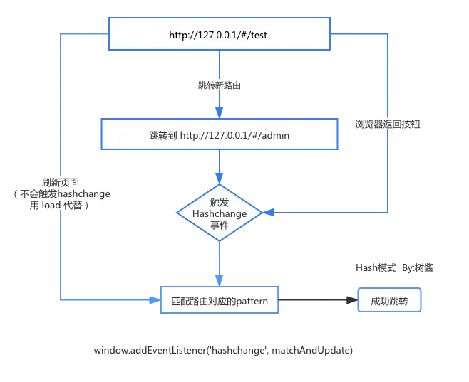 hash模式即是通过 hash 值(类似锚点)的变化,浏览器不用向服务器发起请求,也就无需刷新页面。而浏览器是怎么监听变化的呢?就是通过url中hash 值的变化,此时还好触发 hashchange 事件,通过此事件的触发我们就可以清晰知道hash发生了什么变化