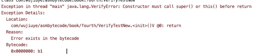 为模拟类加载阶段抛出一个VerifyError,我使用asm编写了一个测试类,在实现这个测试类的实例初始化方法<init>时,我并未生成调用父类的实例初始化方法<init>。asm编写测试类的代码如下。