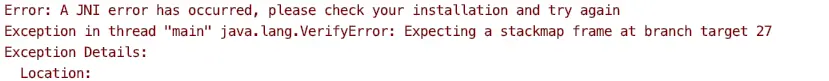 这个例子抛出的java.lang.VerifyError描述信息是 Expecting a stackmap frame at branch target 27,从虚拟机中找到的源码如下。