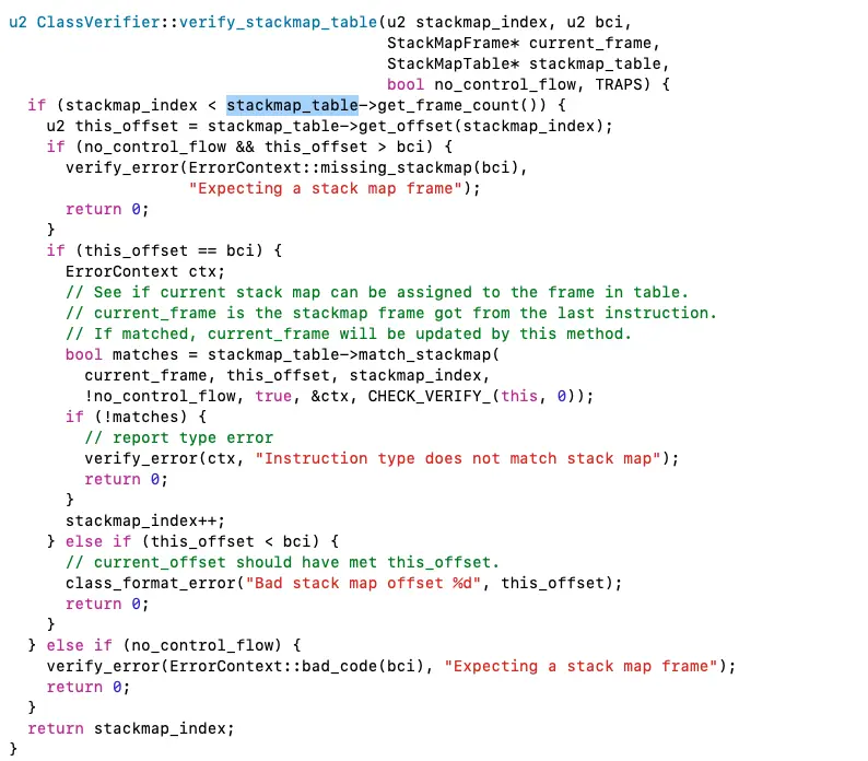 从hotspot源码中找到抛出该异常的位置,字节码验证工作都是在vm/classfile/verifier.cpp这个c++代码文件中完成的。如例子中抛出的异常。