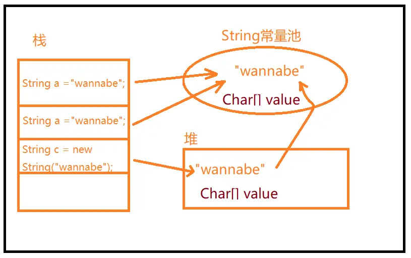 虽然a,b,c, wannabe是不同的对象,但是String的内部结构我们是可以理解上面的。String c = new String ("wannabe");虽然c的内容是创建在堆中,但是他的内部value还是指向String常量池的wannabe的value,它构造wannabe时所用的参数依然是wannabe字符串常量。