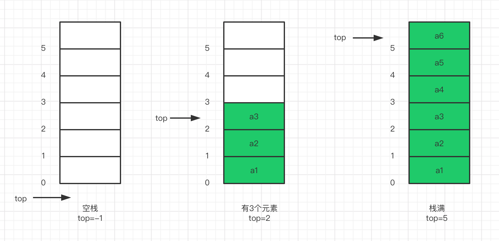 即物理结构是顺序存储,先开辟一块内存空间(和顺序存储链表一样有没有),每push一个新元素,栈顶标记top+1,直到开辟的空间被存满。每Pop一个栈顶元素,top-1,也就是下一个元素变成栈顶元素。
