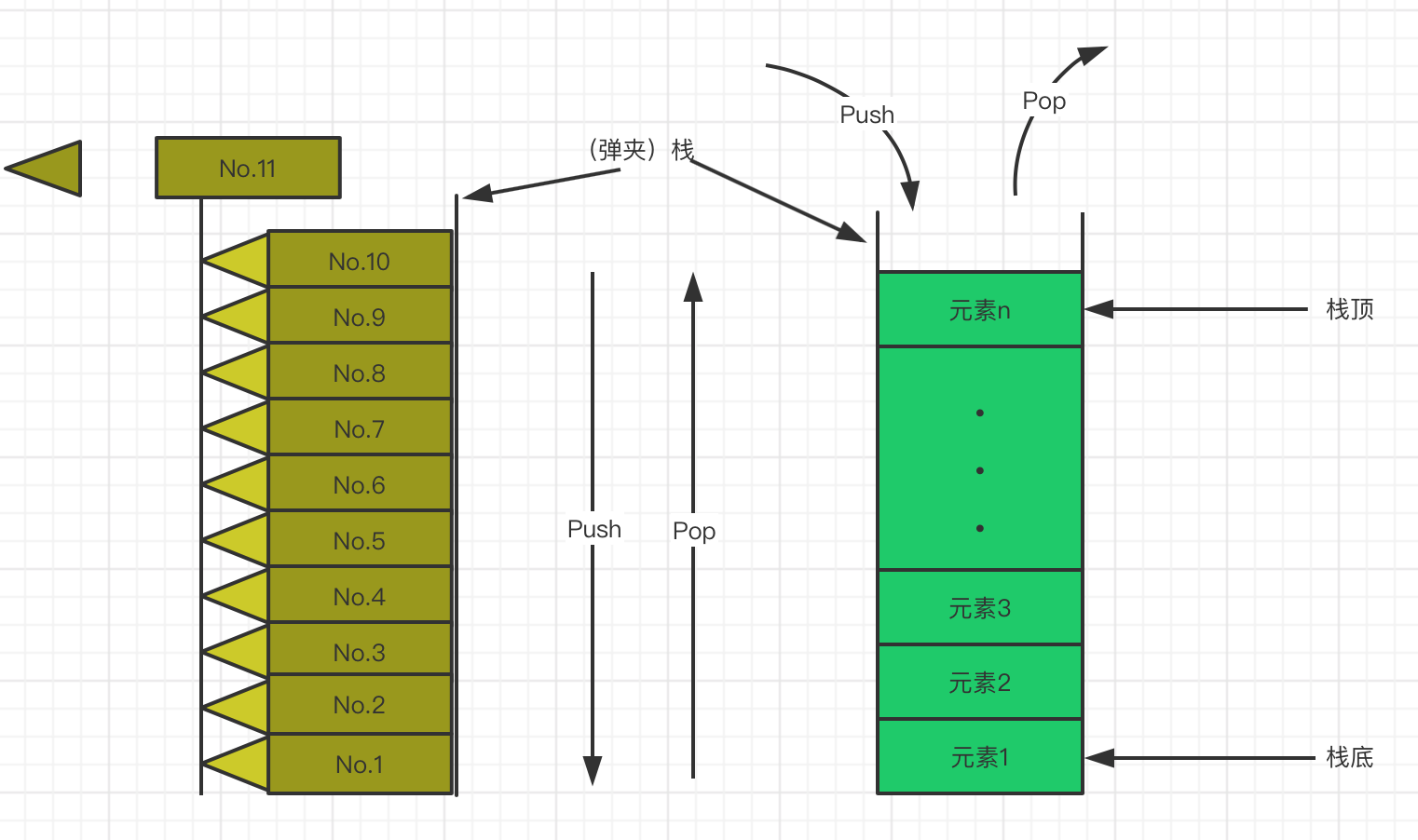 先上官方定义:栈(stack)又名堆栈,它是一种运算受限的线性表。限定仅在表尾进行插入和删除操作的线性表。这一端被称为栈顶,相对地,把另一端称为栈底。向一个栈插入新元素又称作进栈、入栈或压栈,它是把新元素放到栈顶元素的上面,使之成为新的栈顶元素;从一个栈删除元素又称作出栈或退栈,它是把栈顶元素删除掉,使其相邻的元素成为新的栈顶元素。