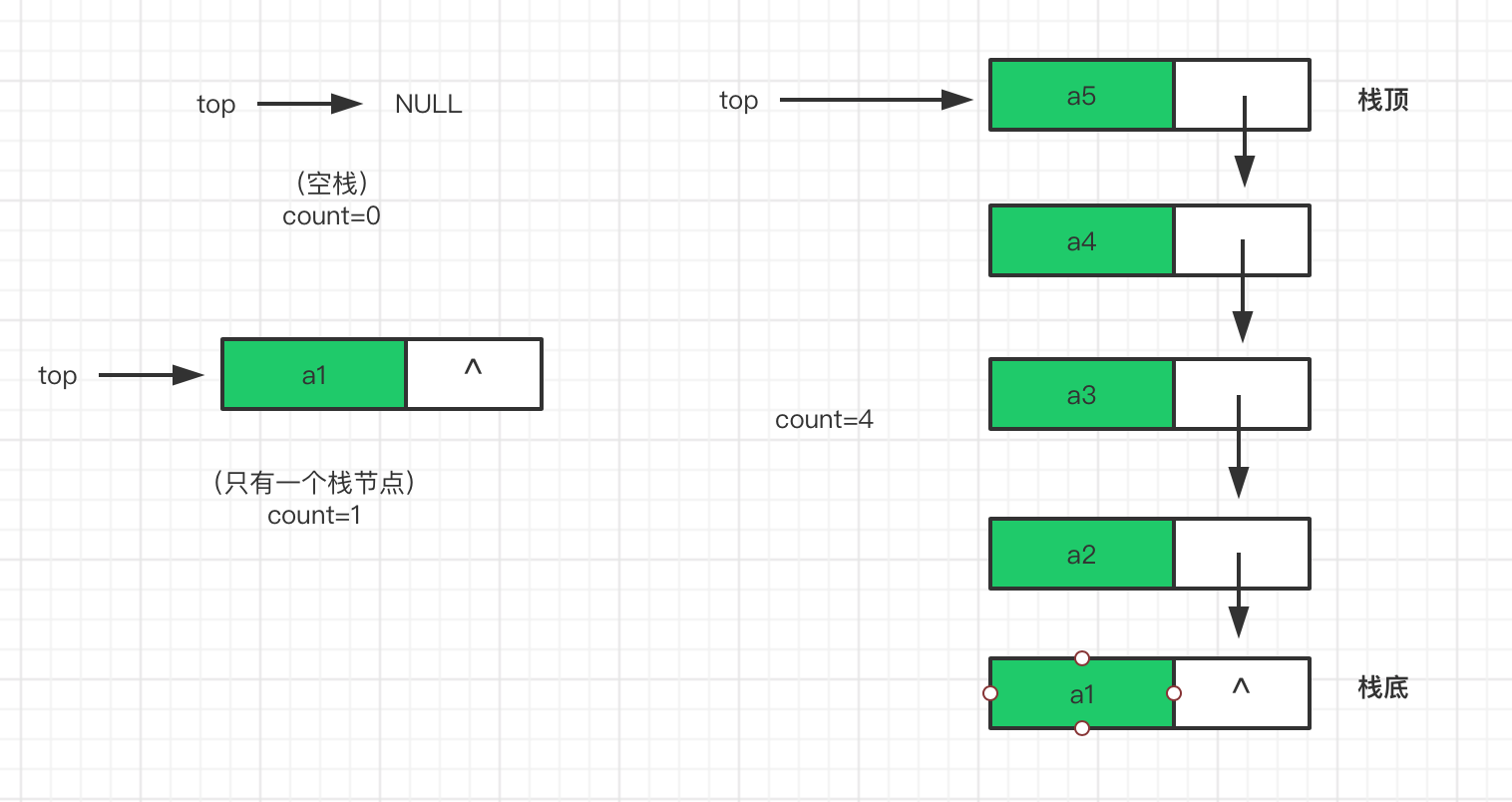 以链表的形式,新入栈的节点,next指向原来的栈顶节点,插在链表的最前端,成为新的栈顶(和链表的头插法像不像??!!!)。 用top标记栈顶节点,而不是上面顺序存储的位置,每一次入栈新节点,top指向新栈顶节点,count也随之+1。出栈时,top指向栈顶节点的next节点,count-1。
