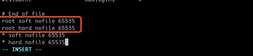 可以重新配置的这个句柄限制数,可以看到默认给 root 用户配置了限制数为 65535,即这个限制是针对 root 用户打开的进程。