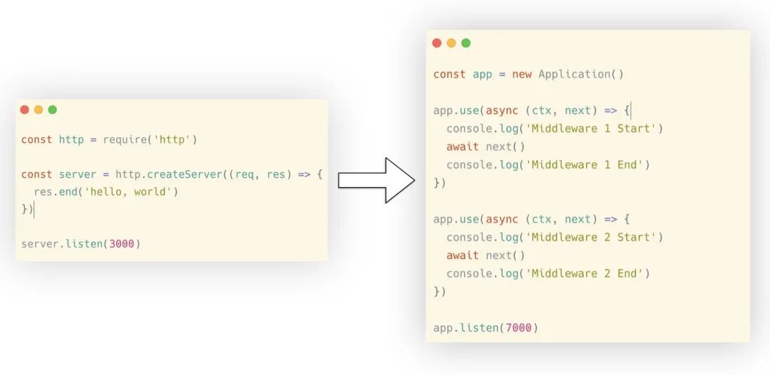 const Koa = require('koa')const app = new Koa()app.use(async (ctx, next) => { console.log('Middleware 1 Start') await next() console.log('Middleware 1 End')})app.use(async (ctx, next) => { console.log('Middleware 2 Start') await next() console.log('Middleware 2 End') ctx.body = 'hello, world'})app.listen(3000)// output// Middleware 1 Start// Middleware 2 Start// Middleware 2 End// Middleware 1 End