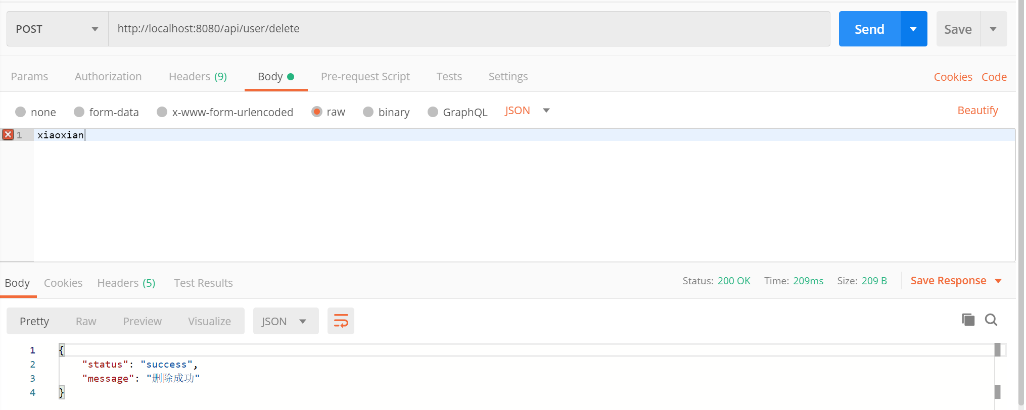 重新运行,使用 Postname 访问 http://localhost:8080/api/user/delete