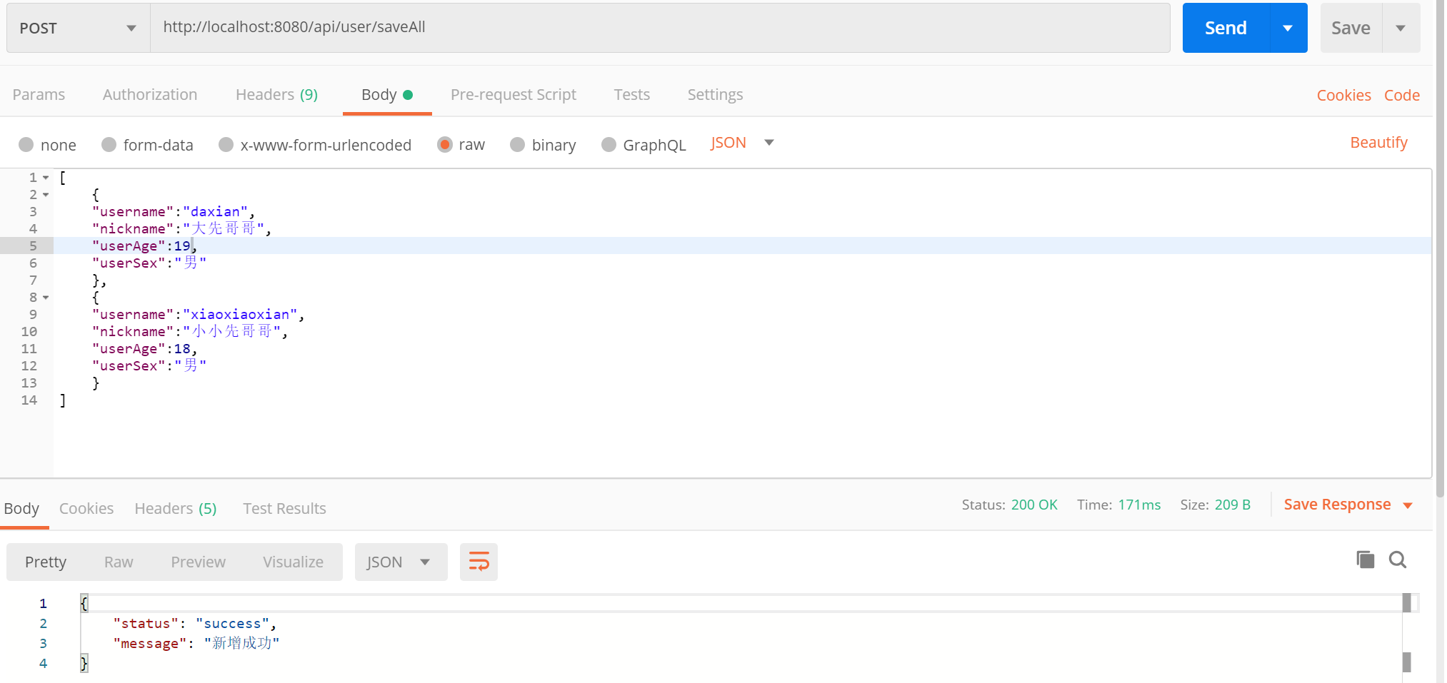 重新运行,使用 Postname 访问 http://localhost:8080/api/user/saveAll ,更改传入数据,查看返回结果。