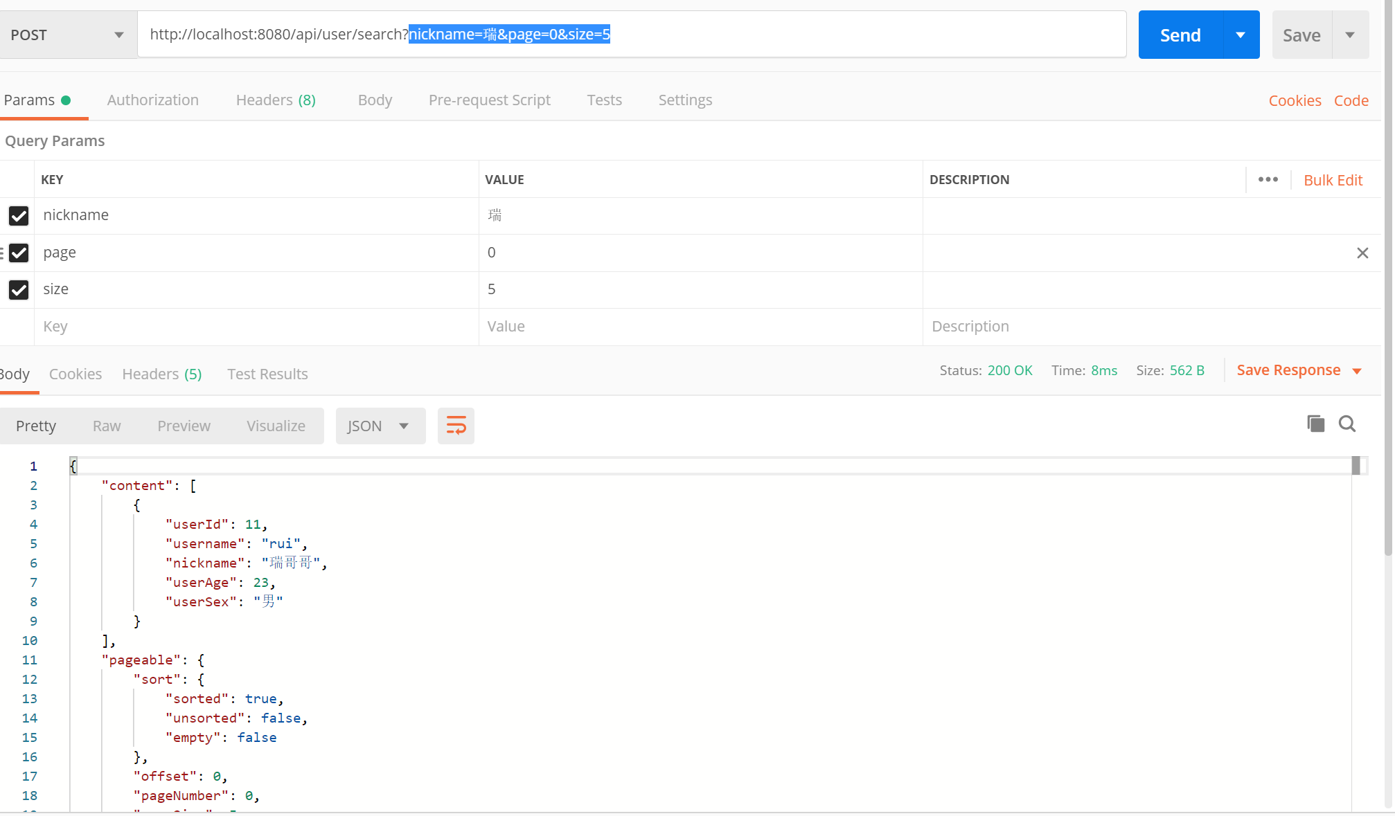 重新运行,使用 Postname 方式访问 http://localhost:8080/api/user/search?nickname=瑞&page=0&size=5 ,可以看到返回如下所示的数据:
