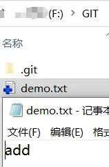 - 首先在F://GIT目录下创建一个demo.txt 文件,里面的内容是add(随便写的)、然后进行一次add操作(省略)
