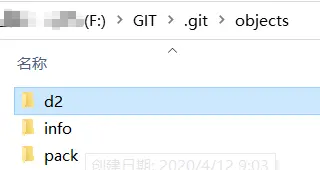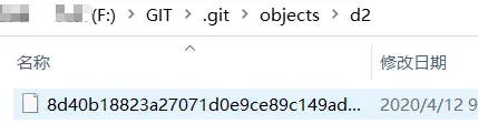 - 看下.git/objects下的变化,多了一个d2文件夹(其实就是上面hash值的前两个字符)、d2文件夹下有一个文件、文件名是hash值后面的字符(8d40b18823a27071d0e9ce89c149adb3f9c4ee )