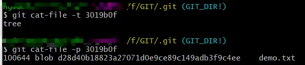 - 如法炮制,看下文件类型和内容、看结果该文件对应的是tree存储对象、内容记录了 此次生成的blob存储对象的键值和 文件路径(demo.txt)