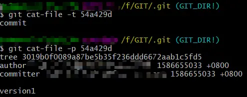 - 最后看一下另外一个文件的类型和内容、看结果该文件对应的是commit存储对象、内容记录了相应tree对象的键值、提交人信息和时间、还有对应的commit message(version1)其实还应该有一个parent信息(内容是上一次commit键值)、因为我们只进行了一次commit、所以没看到