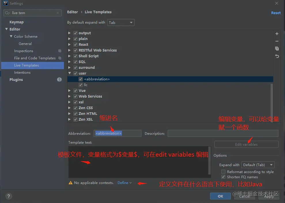 Abbreviation(缩进名):在此字段中,指定模板的缩写,即在编辑器中标识模板的字符序列。