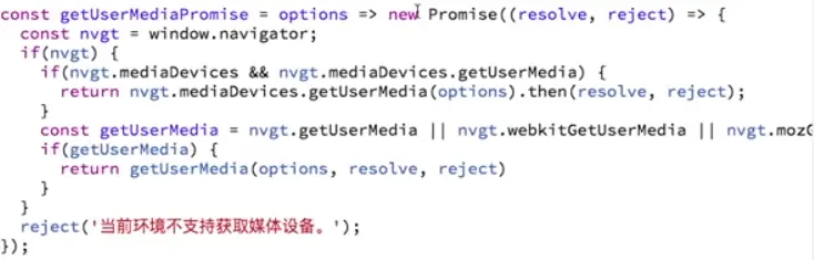 window.navigator.getUserMedia,返回一个promise,参数是stream,将其赋值给videoElement.srcObject