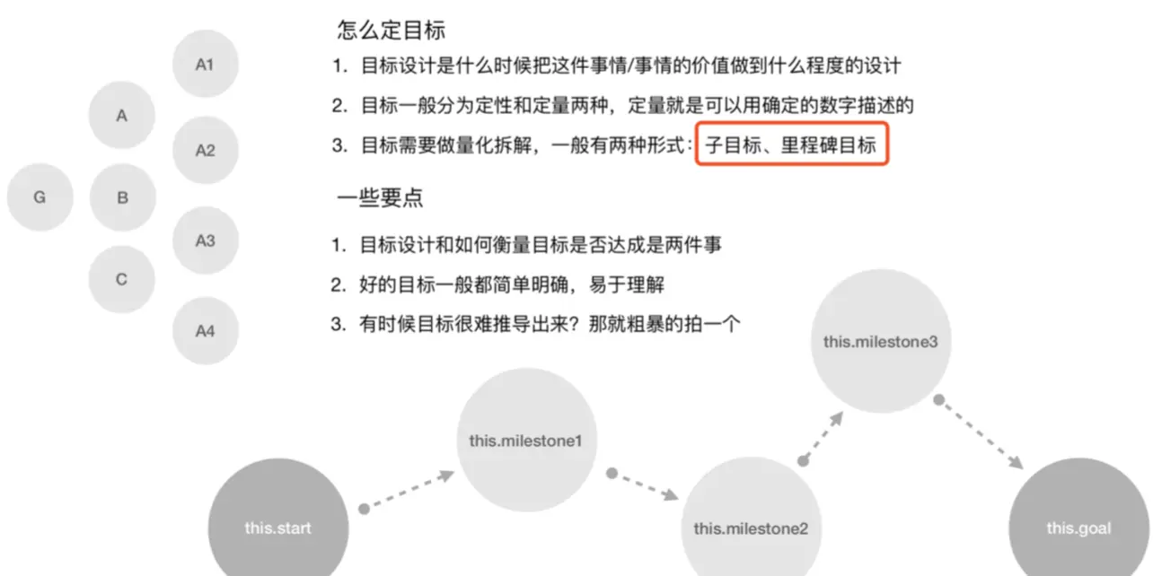 目标定义——>目标拆解——>拆分为多个里程碑——>主动汇报