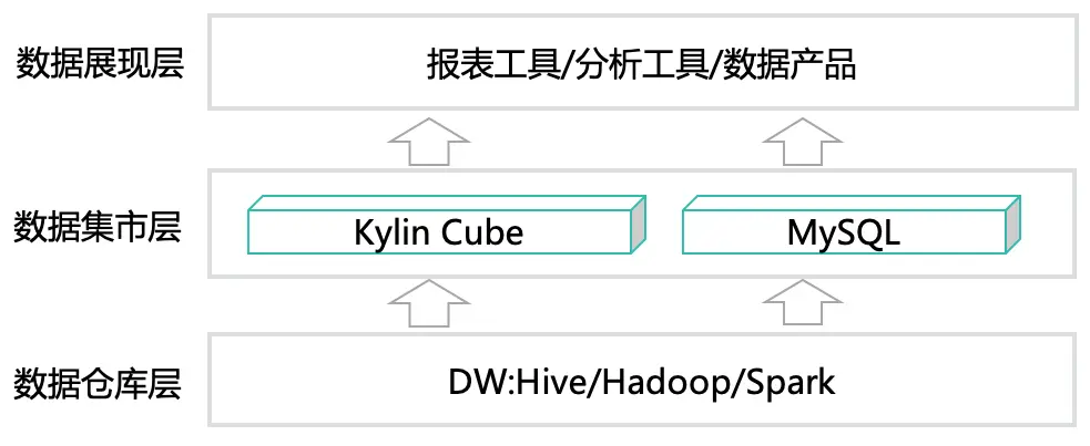 目前,互联网业务规模变得越来越大,不论是业务生产系统还是日志系统,基本上都是基于Hadoop/Spark分布式大数据技术生态来构建数据仓库,然后对数据进行适当的分层、加工、管理。而在数据应用交互层面,由于时效性的要求,数据最终的展现查询还是需要通过DBMS(MySQL)、MOLAP(Kylin)引擎来进行支撑。如下图所示: