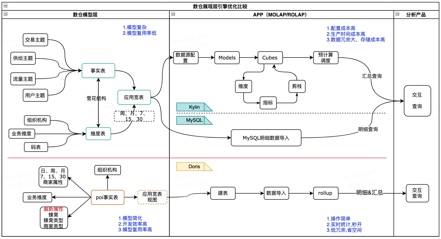 - 由于MOLAP不支持明细数据的查询,在“汇总+明细”的应用场景中,明细数据需要同步到DBMS引擎来响应交互,增加了生产的运维成本。