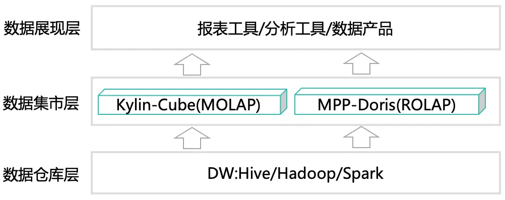 架构上通过MOLAP+ROLAP双引擎模式来适配不同应用场景,如下图所示: