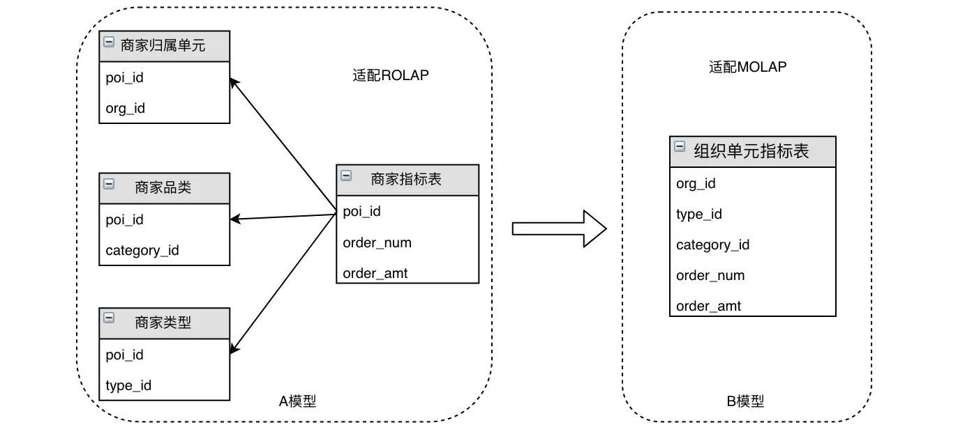 ROLAP: 当业务分析维度灵活多变或者特定到最新的状态时(如上图A模型中,始终使用最新的商家组织归属查看历史),预计算回溯历史数据成本巨大。在这种场景下,将数据稳定在商家的粒度,通过现场计算进行历史数据的回溯分析,实现现用现算,可以节省掉预计算的巨大成本,并带来较大的应用灵活性。这种情况下适合MPP引擎支撑下的ROLAP生产模式。