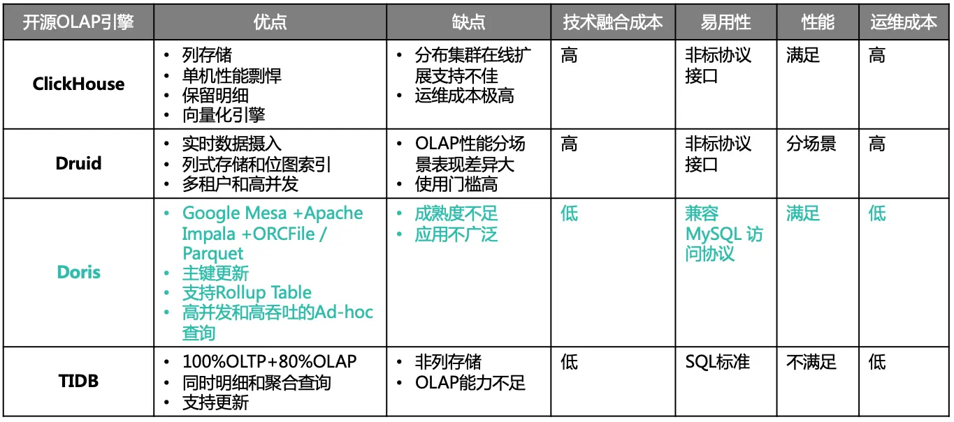目前开源的比较受关注的OLAP引擎很多,比如Greenplum、Apache Impala、Presto、Doris、ClickHouse、Druid、TiDB等等,但缺乏实践案例的介绍,所以我们也没有太多的经验可以借鉴。于是,我们就结合自身业务的需求,从引擎建设成本出发,并立足于公司技术生态融合、集成、易用性等维度进行综合考虑,作为选型依据,最终我们平台部门选择了2018年刚进入Apache社区的Doris。