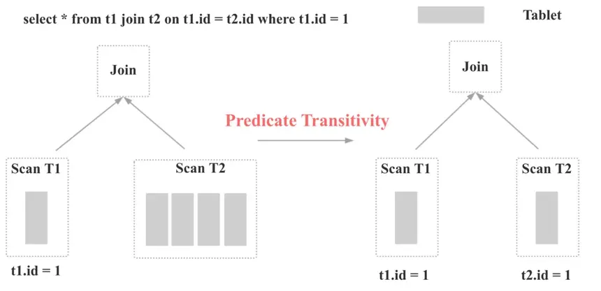 于是我们在Doris中实现了第一个优化:Join谓词下推的传递性优化(MySQL和TiDB中称之为Constant Propagation)。Join谓词下推的传递性优化是指:基于谓词t1.id = t2.id和t1.id = 1, 我们可以推断出新的谓词t2.id = 1,并将谓词t2.id = 1下推到t2的Scan节点。 这样假如t2表有数百个分区的话,查询性能就会有数十倍甚至上百倍的提升,因为t2表参与Scan和Join的数据量会显著减少。