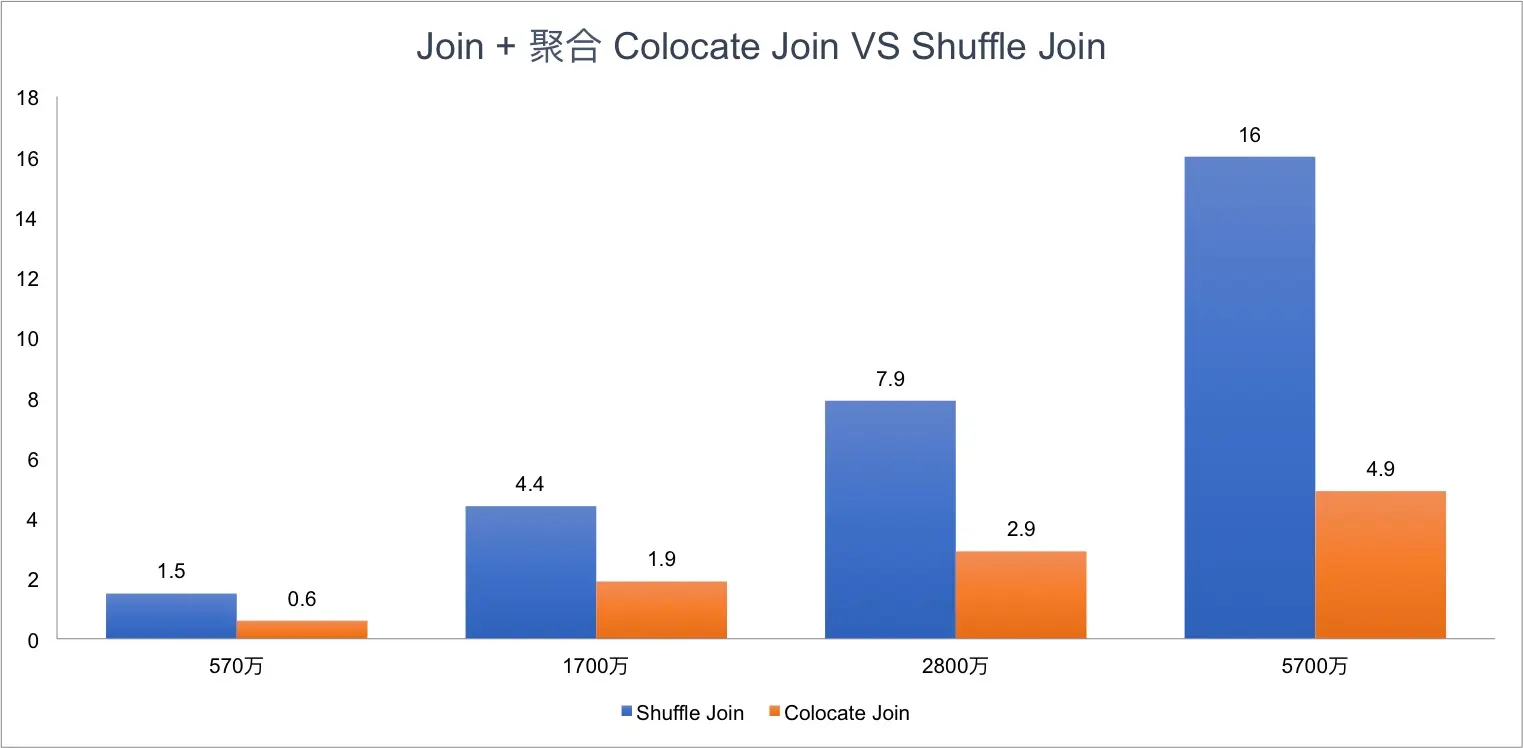 对于下面的SQL,Doris Colocate Join和Shuffle Join在不同数据量下的性能对比如下: