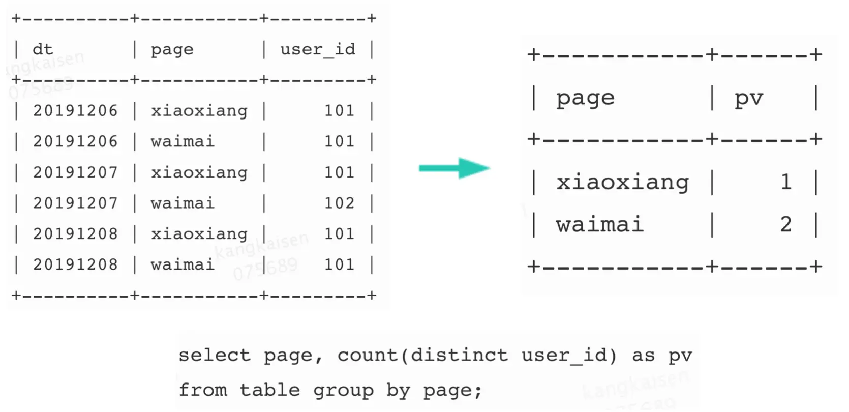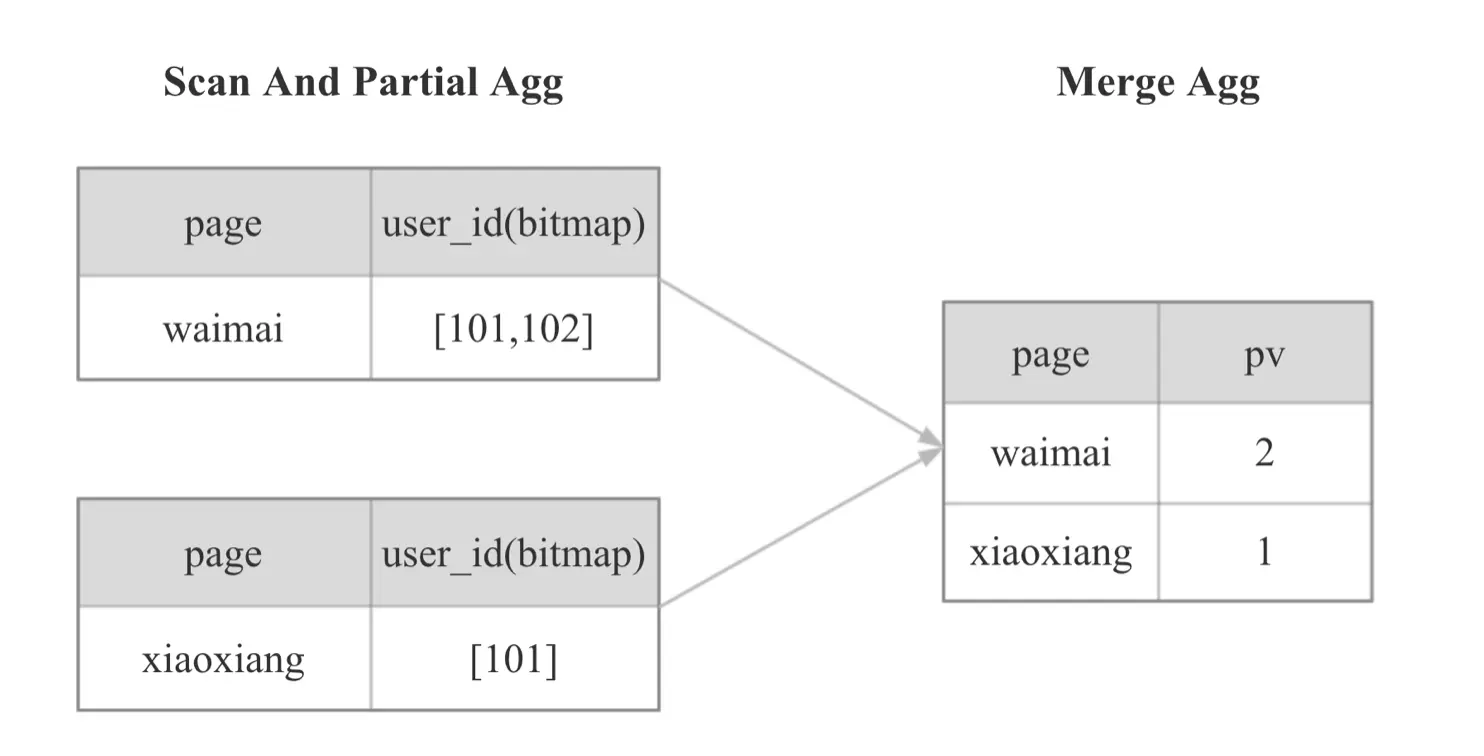 对于上图计算PV的SQL,Doris在计算时,会按照下图的方式进行计算,先根据page列和user_id列group by,最后再Count:
