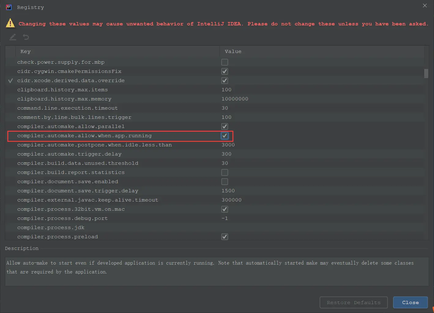 Ctrl + Alt + Shift + /调出 Registry 窗口,勾选compiler.automake.allow.when.app.running选项