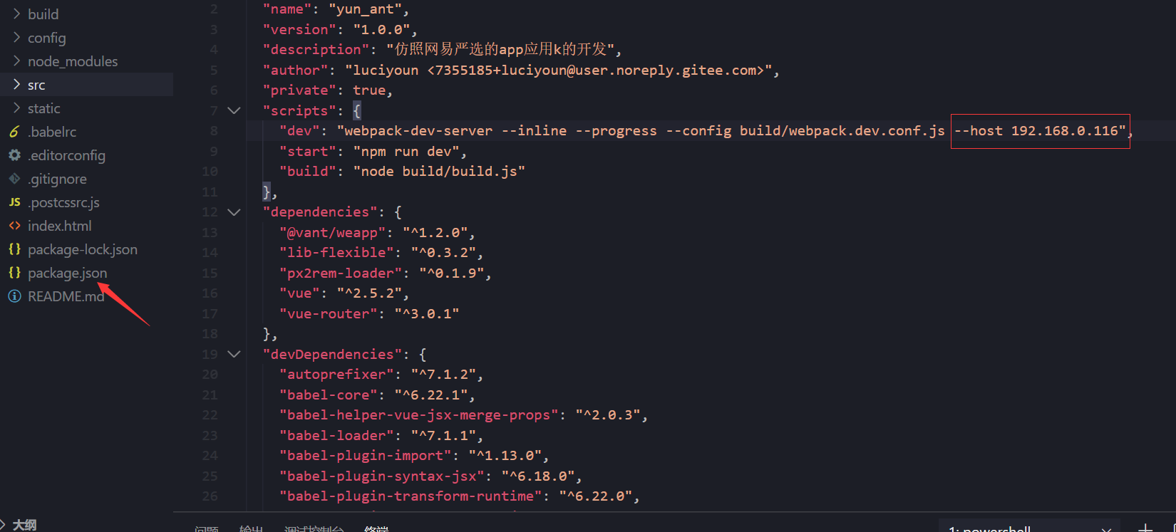 3.打开自己项目中的 package.json 添加 --host 指令