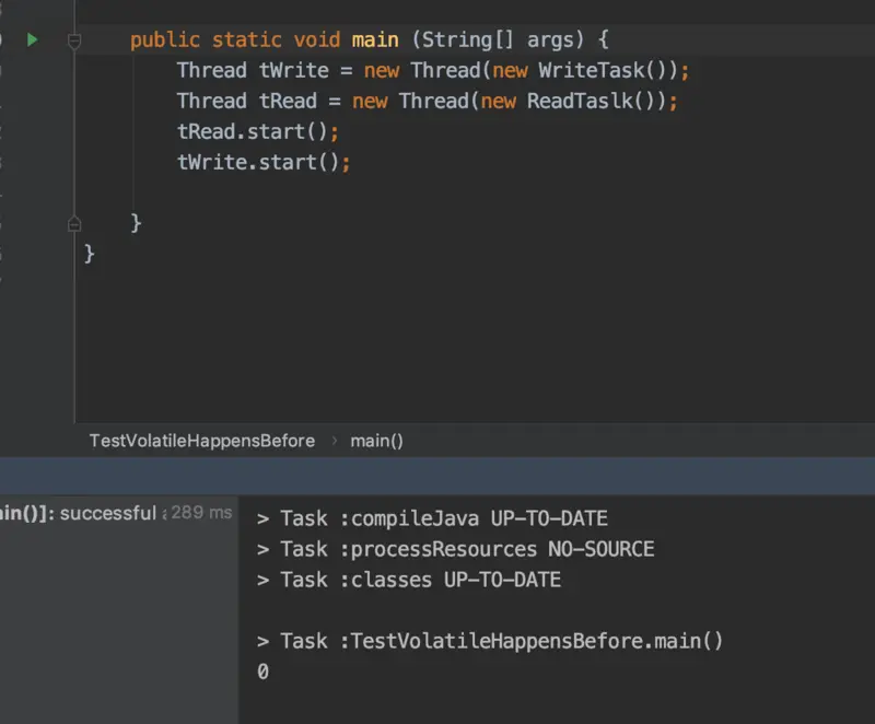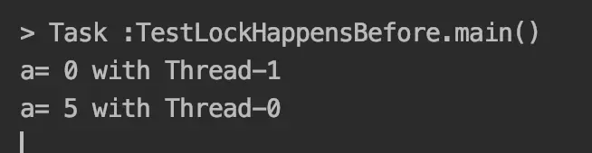 则关系变成了 thread1 happens-before thread0,则thread1对a的修改对thread0可见,运行结果如图: