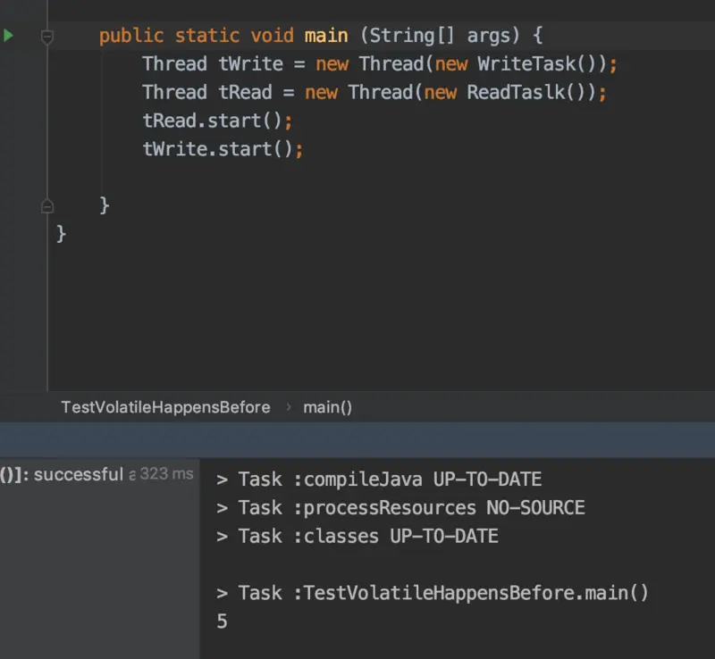 即如果保证线程A对一个volatile变量的写发生在另一个线程B对于这个变量的读之前,在A对这个变量的操作对B可见。 下面通过一个简单的代码样例验证这一规则。