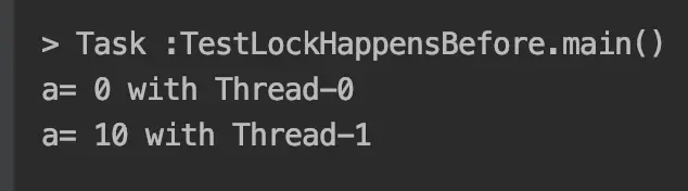 因为thread0 符合happens-before thread1的规则,所以thread0对变量a的修改对thread1可见,故运行结果为如图: