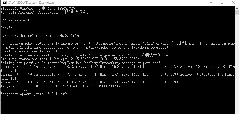 jmeter -n -t F:\jmeter\apache-jmeter-5.2.1\backups\测试计划.jmx -l F:\jmeter\apache-jmeter-5.2.1\backups\result.txt -e -o F:\jmeter\apache-jmeter-5.2.1\backups\webreport