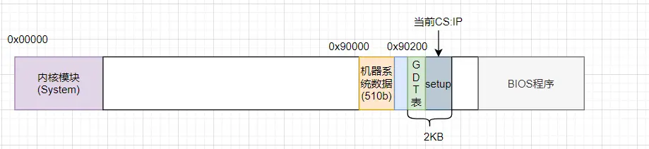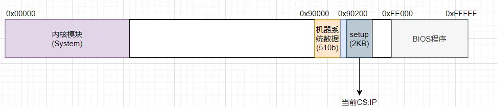 我们已经通过bootsect.s将setup模块加载至0x92000处,正好在bootsect.s运行结束的位置,并且system内核模块也已经加载进入内存,而setup主要作用是让操作系统设置起来。