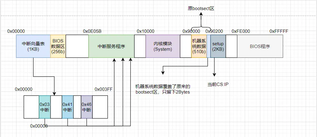 setup会通过BIOS提供的中断程序加载内核(system程序)运行所需的机器系统数据,例如:光标位置(0x03)、显示页面等数据,并通过0x41、0x46中断向量所指的内存区域中获取硬盘参数表1和硬盘参数表2,而这些数据(510Bytes)放在bootsect区, 可见操作系统对于空间的利用是十分严格的;