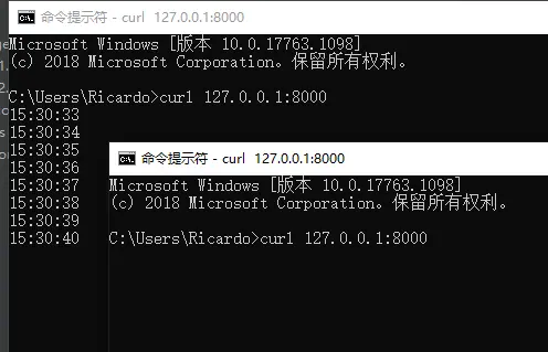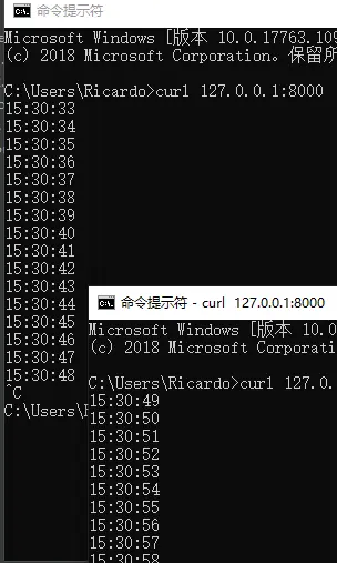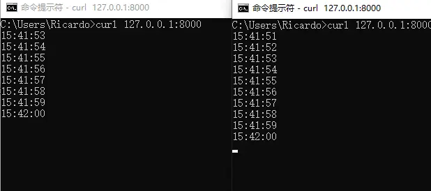 可以看到,如果同时启动两个连接,只有一个连接可以提供打印时间的服务,另一个连接将被阻塞: