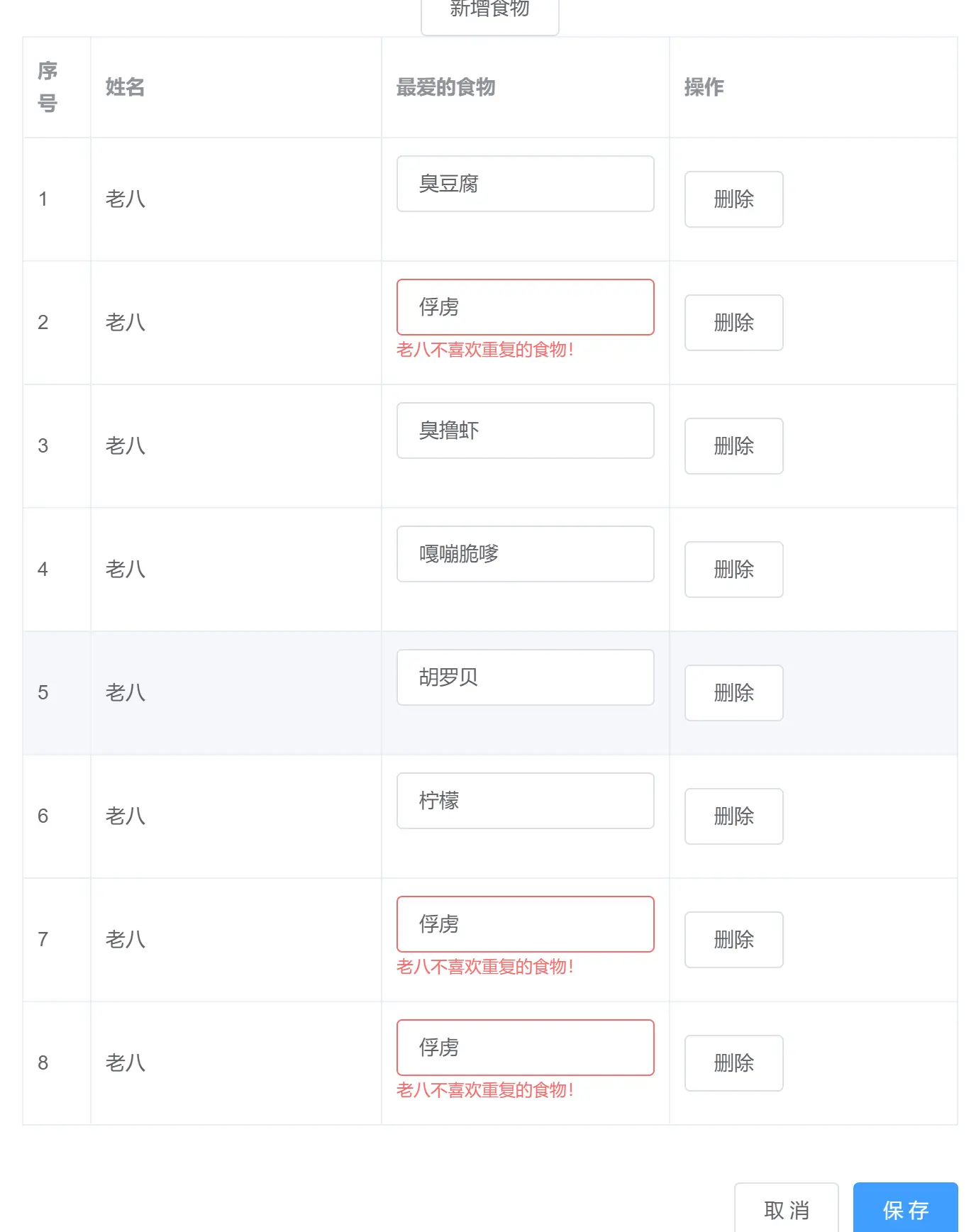 最近接了个需求,要求我写一个表格,这个表格用户可以自由增加删除行以及修改行内的数据,输入的内容有一定的验证要求,同时记录下用户的操作,在上传数据的时候提示用户进行了哪些操作。如图: