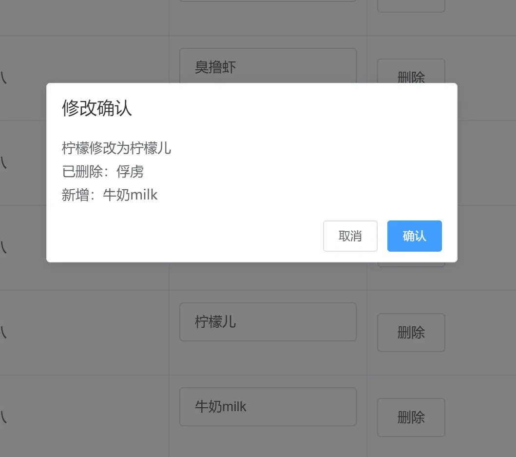 记录修改痕迹,我们只需要在进入弹窗的时候记录一份原始数据,然后再比对原始数据以及提交时候的数据即可。